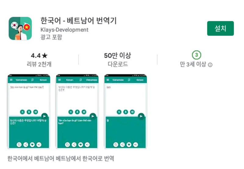 한국어를 베트남어로 번역해주는 어플은 손쉽게 찾아볼 수 있다. 리뷰 평점이 4.4점인 베트남어 번역기를 다운로드 받아 설치 했다. 무료 설치가 가능했고, 별도의 비용은 청구되지 않았다.