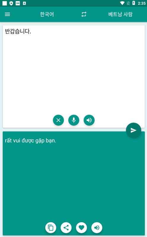 반갑습니다를 입력했더니 역시나 아래쪽에 번역이 된다. 번역된 내용을 복사하거나 아니면 공유할 수도 있다. 하트 모양의 아이콘을 터치하게 되면, 즐겨찾기에 등록되기 때문에 다음에 베트남어를 찾고싶을때 참고하면 될 것 같다.