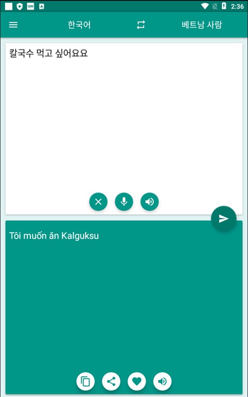 칼국수를 먹으로 가고싶을때 베트남 현지인들에게 물어보기로 했다. 칼국수 먹고 싶어요라고 물었더니 번역기의 화면에서 아래쪽에 번역이 완료된 화면이 나타난다.