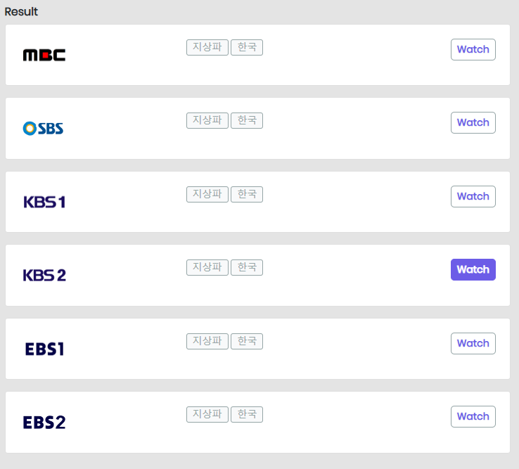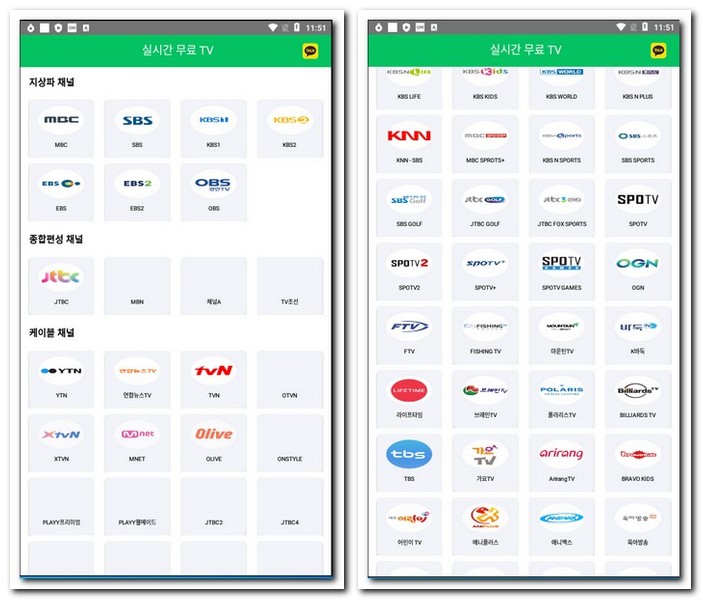 지상파 채널의 별도 카테고리가 존재하는데, 단순하게 터치만 하면 되어서 웹사이트를 이용하는 방법보다 더 간편하고 편리하다는 장점을 가지고 있다.