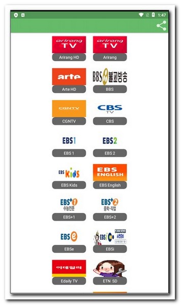다른 어플에서는 채널개수는 적지만 확실히 영상시청이 가능하다는 리뷰댓글을 보고나서 선택해봤다. 실제로 영상시청까지 갈 수 있나 궁금한데, 특히 EBS, ETN SD채널이 마음에 들었다.