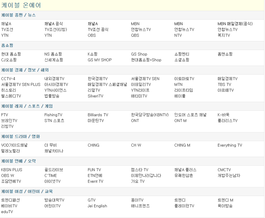 그밖에도, 케이블 온에어 채널에서는 채널A, FTV, 트렌디패션, TV조선 등도 함께 시청을 할 수 있다.