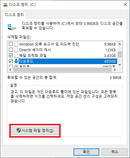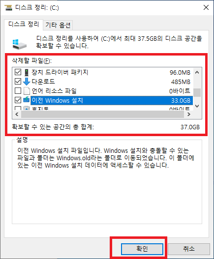 깔끔하게 윈도우10 불필요한 디스크 저장공간을 정리할 수 있게 되었다.