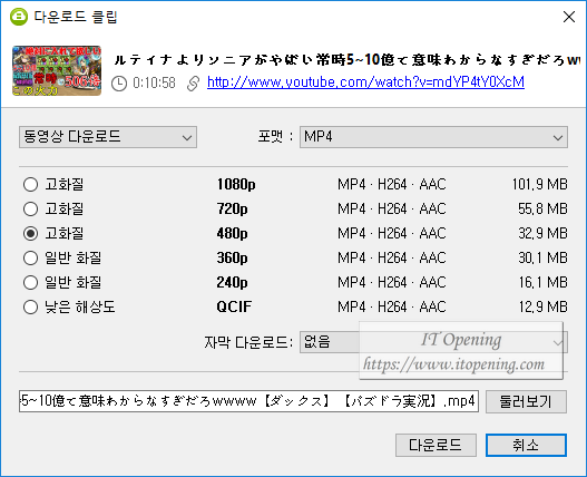다운로드 클립이 나타나며, 화질 및 포맷을 선택해서 [다운로드] 받는다.