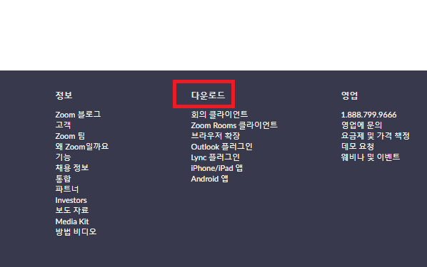 zoom 화상회의 채팅 프로그램을 다운로드 받기 위해서는 zoom 공식 홈페이지 사이트에 접속을 한다. 그리고 가장 아래쪽에 다운로드 버튼이 보이는데 클릭해서 들어간다.