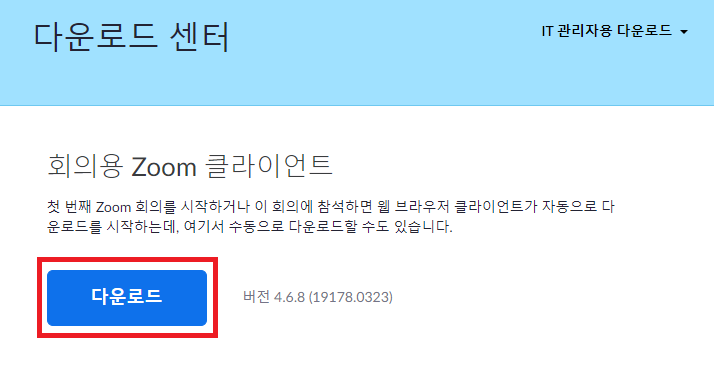 다운로드 센터가 나타나게 된다. 우리가 다운로드 받아야 될 프로그램은 회의용 zoom 클라이언트 프로그램이다. 클릭해서 다운받는다.