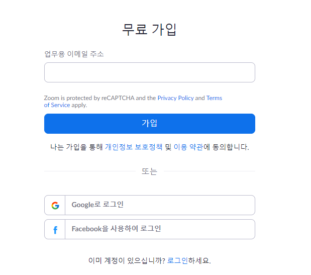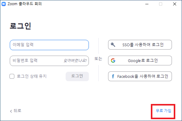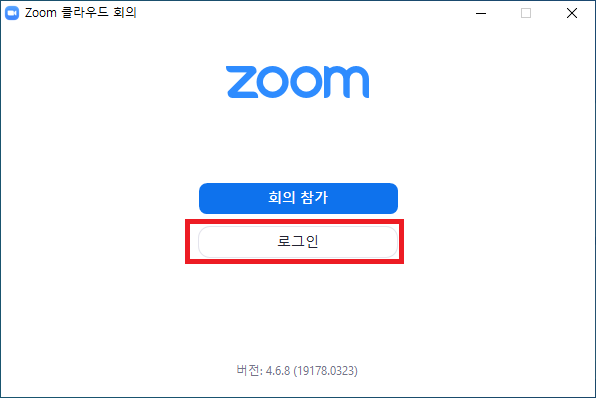 설치가 완료되면 zoom 클라우드 회의 프로그램이 자동 실행 된다. 회의 참가 버튼을 통해서 회의에 참가할 수 있지만 로그인을 해야 된다.