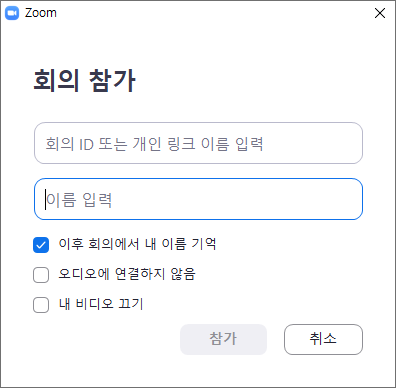 회원가입이 완료되었다면, 다시 처음부터 진행하면 되는데, 최종적으로 회의 참가를 위해서 회의 ID 또는 개인 링크 이름을 입력해야 되고, 사용자의 닉네임을 입력, 그리고 참가버튼을 클릭함으로써 회의 참석을 할 수 있게 된다.