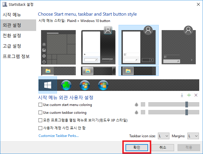 설정항목을 확인할 수 있는데, 외관 설정이라던지, 시작 메뉴, 전환 설정, 고급 설정 등 다양한 메뉴를 선택해서 설정가능하다. 기본으로 하는것이 무난하기 때문에 확인을 선택한다.