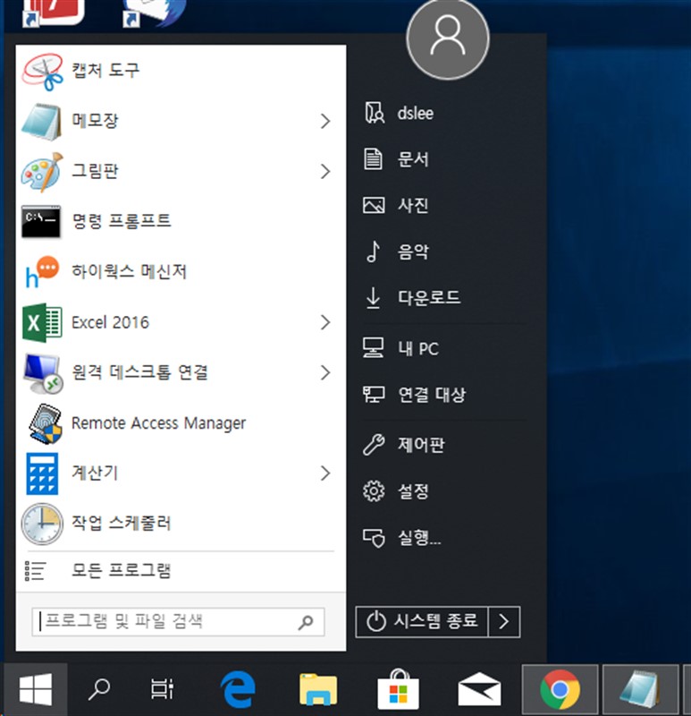시작메뉴를 눌러보게 되면 윈도우10 시작메뉴가 윈도우7으로 바뀐 모습을 확인할 수 있다.
