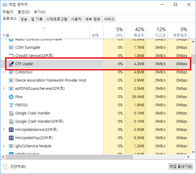 중단 방법 : 작업 관리자 -> 프로세스 -> CTF Loader 선택 -> 작업 끝내기