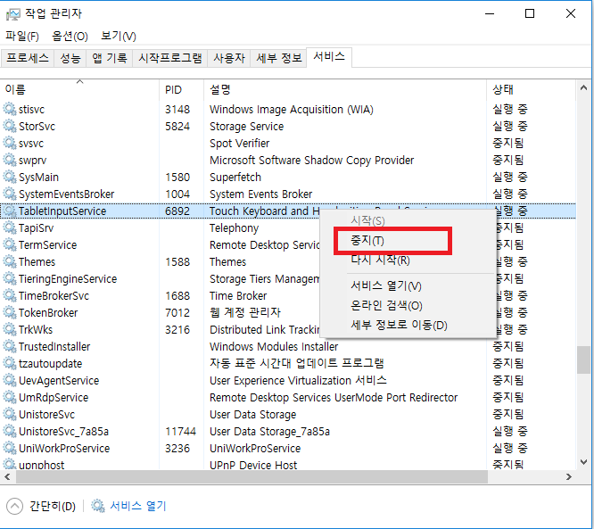 중지 하는 방법은 서비스 -> TableinputService -> 중지를 선택하면 된다.