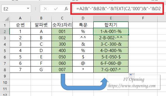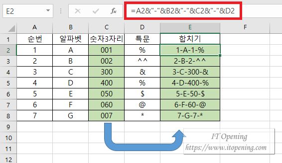 예제를 보면 순번, 알파벳, 숫자3자리, 특문을 하나의 셀에 넣을수 있도록 합치기를 한 모습이다. 수식은 아래를 참고하면 된다.