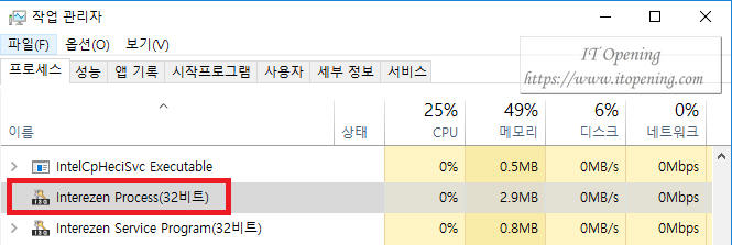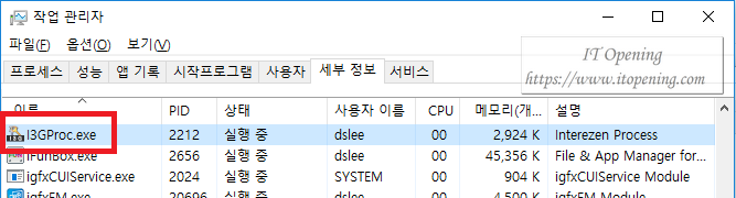 작업 관리자의 프로세스 리스트를 확인해보면 Interezen Process라는 프로세스가 동작중인데, 이게 바로 I3GProc.exe을 실행하게되면 서비스되는 프로세스이다.