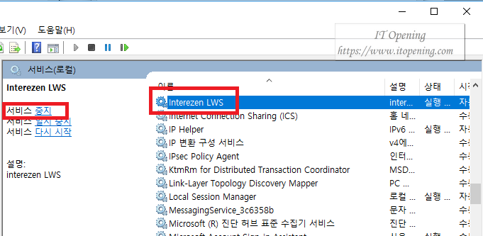 서비스 경로 : 제어판 -> 모든 제어판 항목 -> 관리 도구 -> 서비스 -> interezen LWS