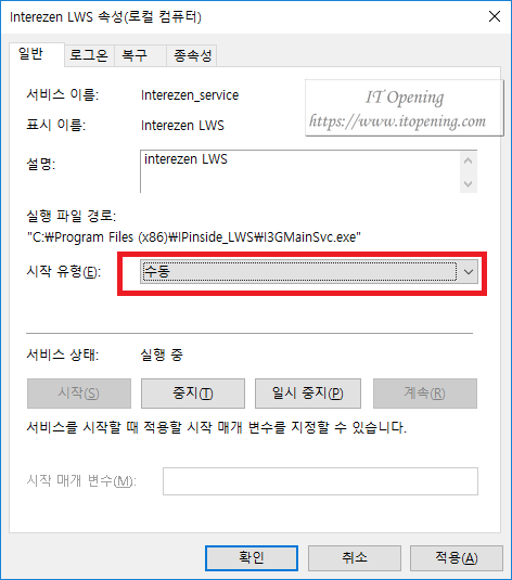 서비스 자동 시작 중지 : interezen LWS -> 동작 -> 속성 -> 시작유형 -> 수동