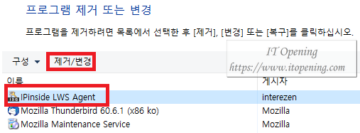 삭제 방법 : 제어판 -> 모든 제어판 항목 -> 프로그램 및 기능 -> IPinside LWS agent -> 제거/변경
