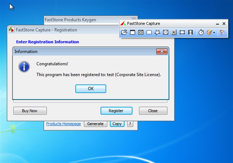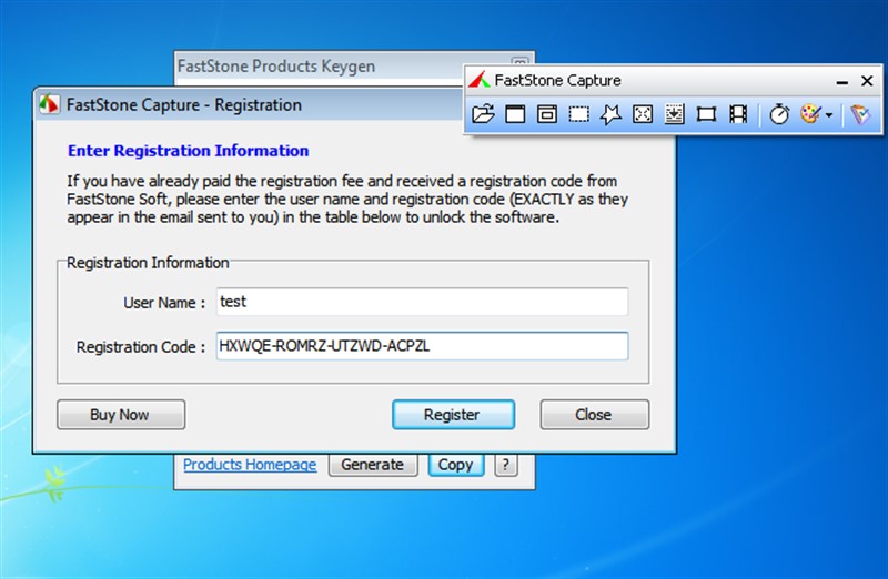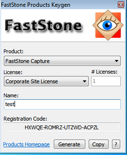 압축해제를 하게되면, faststone products keygen 이라는 프로그램이 존재하는데 실행시킨다. faststone capture 뿐만 아니라 이와 관련된 faststone 제품들에 대해서는 모두 크랙(keygen)이 가능하다.