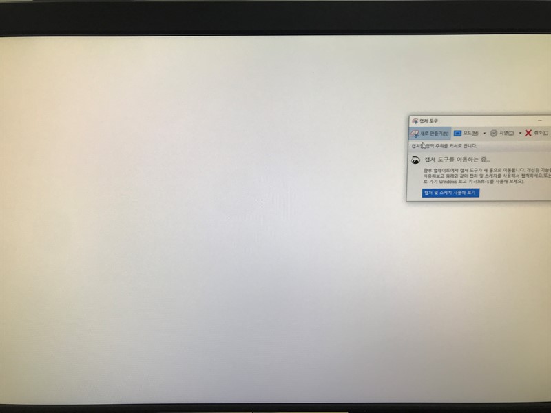 사진과 같이 윈도우10 화면캡쳐 도구를 이용해서 바탕화면이든 인터넷에서 특정 화면을 캡처하려고 했지만 회색인지 흰색인지 원인모를 화면이 보이는걸 확인할 수 있다.