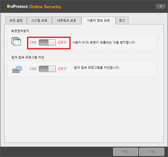 일단 프로그램 삭제를 조금 더 지켜보기로 하고, 사용자 정보 보호 -> 화면캡처방지가 현재 ON 설정되어 있는데, OFF로 변경해주도록 한다. 사용자 PC의 화면이 유출되는 것을 방지해주는 좋은 기능이긴 하다. 보안을 위해서는 권장한다.