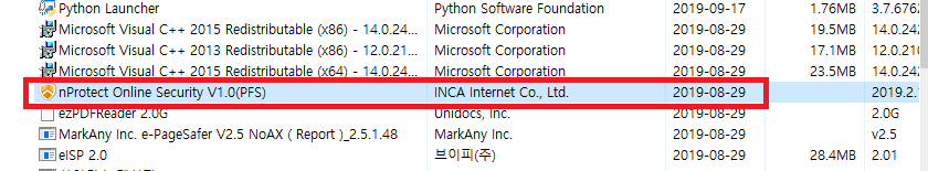더블클릭해서 의심되는 아이콘이 나타났었고, nProtect Online Security 라는 프로그램이 실행중인걸 확인할 수 있었다. 이 프로그램은 내가 직접 설치한 기억이 없는데 언제 설치된 것일까?