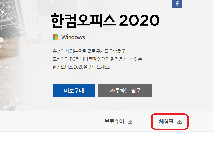 HWP 문서작성을 위해 한글2020을 다운로드 받기 위해서는 홈페이지에 접속하게 되면, 체험판 이라고 클릭할 수 있는 메뉴가 보인다. 클릭해서 다운 받도록 한다.