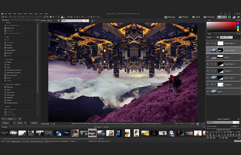 ACDSee Photo Studio Ultimate는 HDR, 포커스 스태킹, 혼합 복제, 고유 한 색상 조정 생성, 얼굴 인식 개선, 텍스트 및 레이어에 대한 제어 강화 등 복합물, 조작 및 혁신적인 그래픽을 생성 할 수있는 유연성을 제공한다.