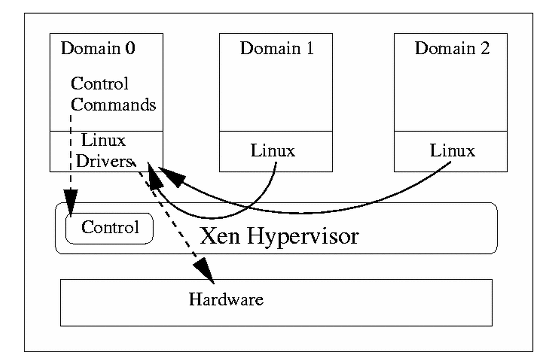 Xen에는 도메인 0라는 특수한 도메인이 존재하는데, 도메인 0는 실제 물리 디바이스와 통신하는 디바이스 드라이버가 있고, 각 도메인을 제어한다.