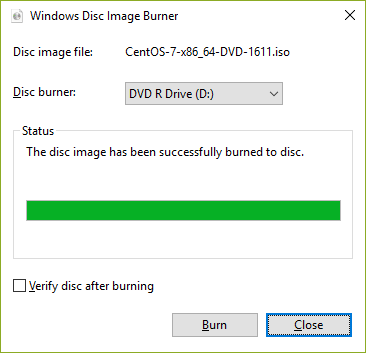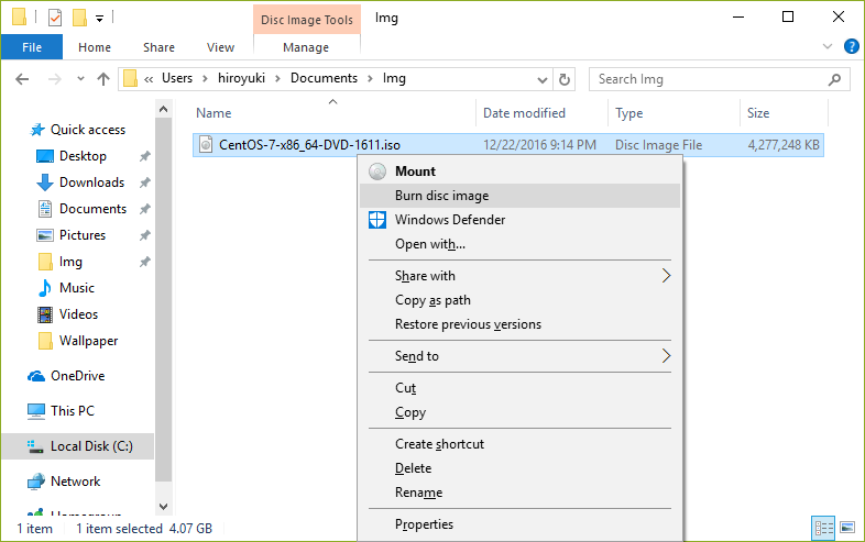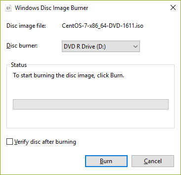 CentOS 7.x의 ISO를 다운로드 한 후 굽기 응용 프로그램을 사용하여 DVD에 구워 설치 디스크를 만든다. Windows 7/8/10 기능으로 작성하는 경우 아래 그림을 참조하면 된다.