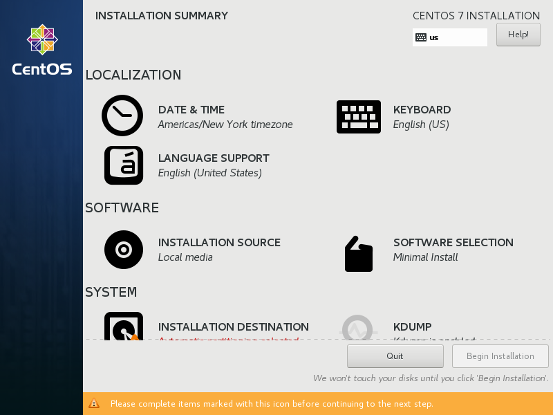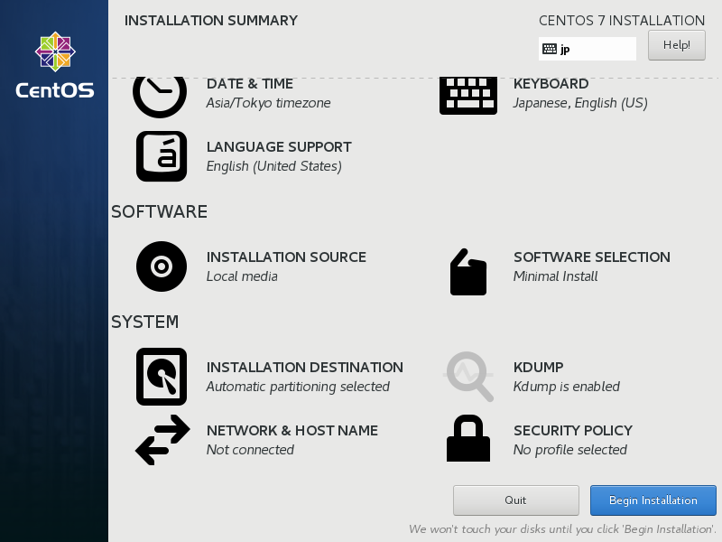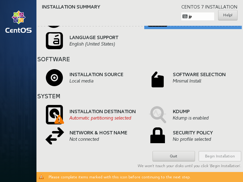 기본 화면으로 돌아간다. [소프트웨어 선택]의 경우 초기 설치를 위해 [최소 설치]로 설치하는 것이 좋았으므로 기본값을 유지해도된다. 그런 다음 [설치 대상] 아이콘을 클릭한다.