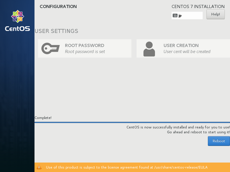 재부팅 후 로그인 프롬프트는 다음과 같이 표시된다. 설치 중에 설정 한 루트 사용자 및 비밀번호로 로그인한다. 정상적으로 로그인 할 수 있으면 CentOS 7 설치가 완료된다.