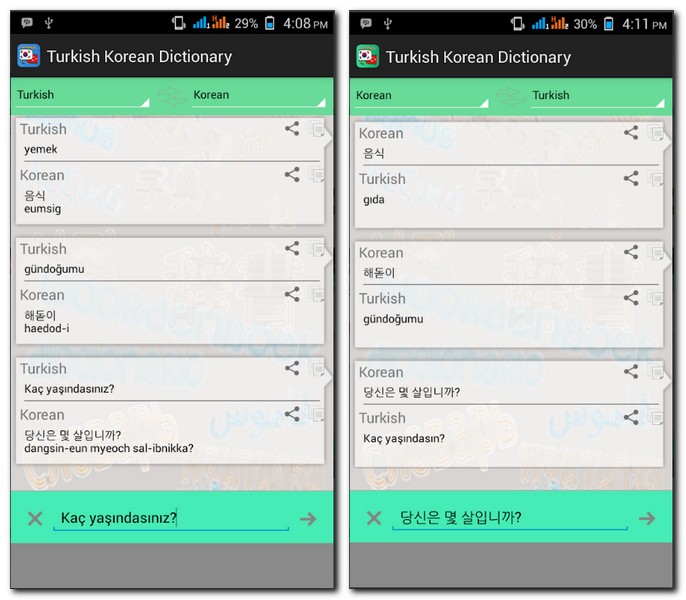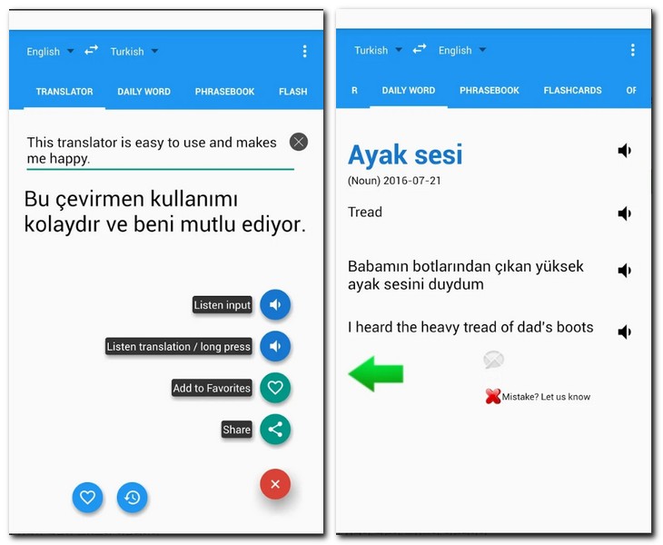 터키어에서 영어로 그리고 다시 영어에서 터키어로 번역할 수 있도록 도와주는 어플 앱이다. 영어 뿐만 아니라 한국어, 일본어, 독일어, 프랑스어, 이탈리어 까지 모두 번역기 기능을 가지고 있다.