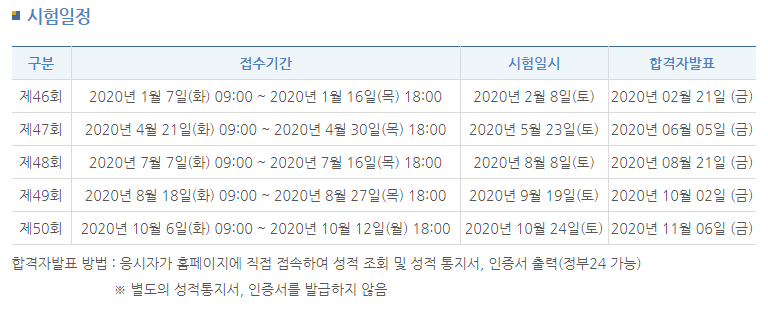 제50회 접수기간은 2020년 10월 6일(화) 09:00 ~ 2020년 10월 12일(월) 18:00, 시험일시는 2020년 10월 24일(토), 합격자발표는 2020년 11월 06일 (금)이다.