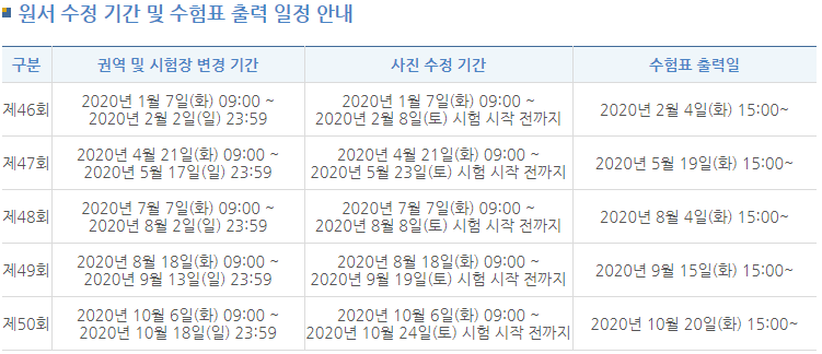 제50회 권역 및 시험장 변경 기간은 2020년 10월 6일(화) 09:00 ~ 2020년 10월 18일(일) 23:59, 사진 수정 기간은 2020년 10월 6일(화) 09:00 ~ 2020년 10월 24일(토) 시험 시작 전까지, 수험표 출력일은 2020년 10월 20일(화) 15:00~ 이후 까지 된다.