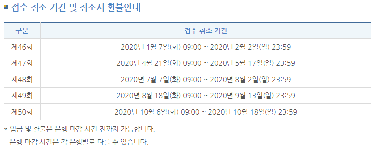 제46회의 접수 취소 기간는 2020년 1월 7일(화) 09:00 ~ 2020년 2월 2일(일) 23:59