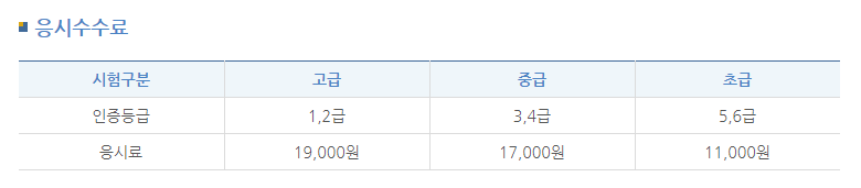 인증등급(급수)에 따라서 응시료는 다르다. 고급(1,2급)의 경우 19,000원, 중급(3,4급) 17,000원, 초급(5,6급) 11,000원의 응시료 비용을 받게 된다.