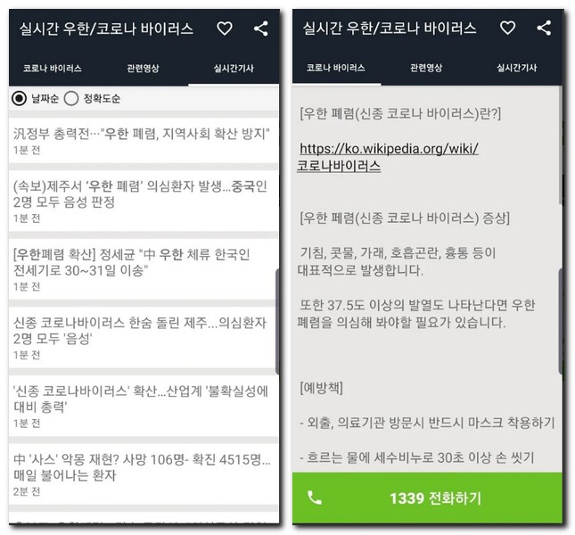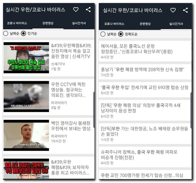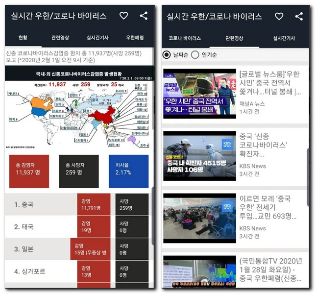 뿐만 아니라 현재 실시간으로 제공되고 있는 신종코로나 바이러스 뉴스 기사와 우한 폐렴관련 유튜브 영상을 실시간으로 시청할 수 있는점도 장점이다.