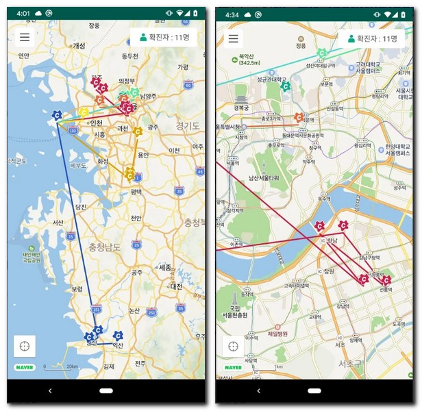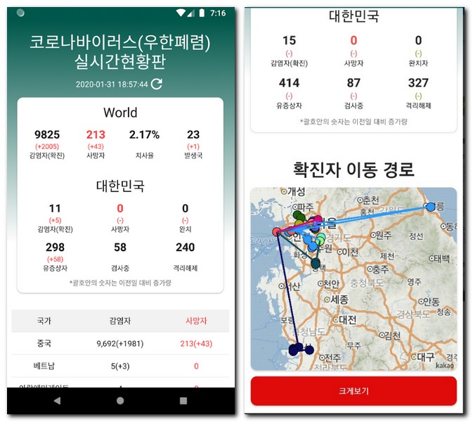 메르스 당시에도 많은 인기를 얻은 어플인데, 이번 신종 코로나 바이러스에서도 우한 폐렴에 걸린 확진자들의 이동 경로를 지도를 통해서 확인할 수 있다.