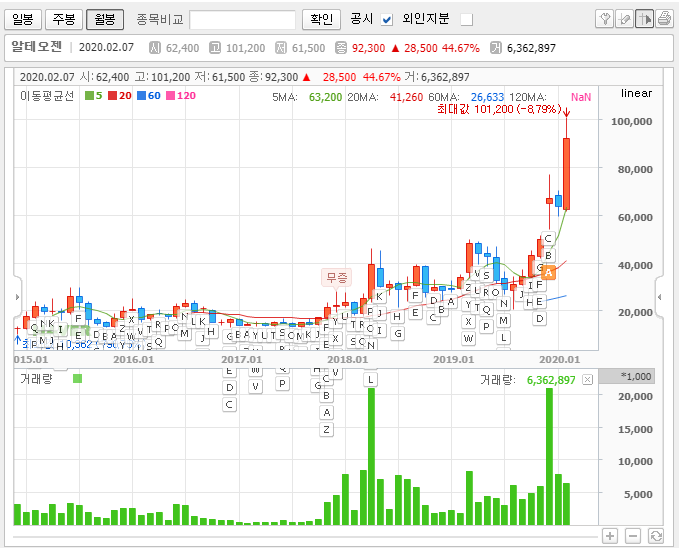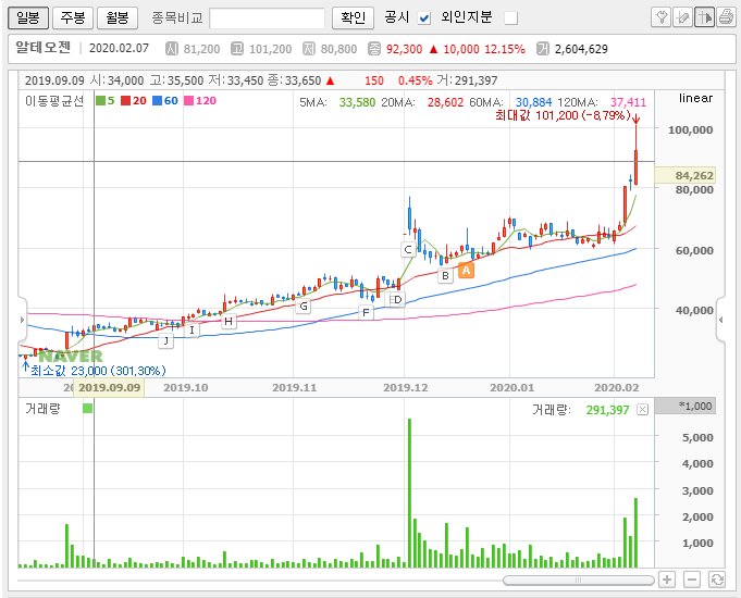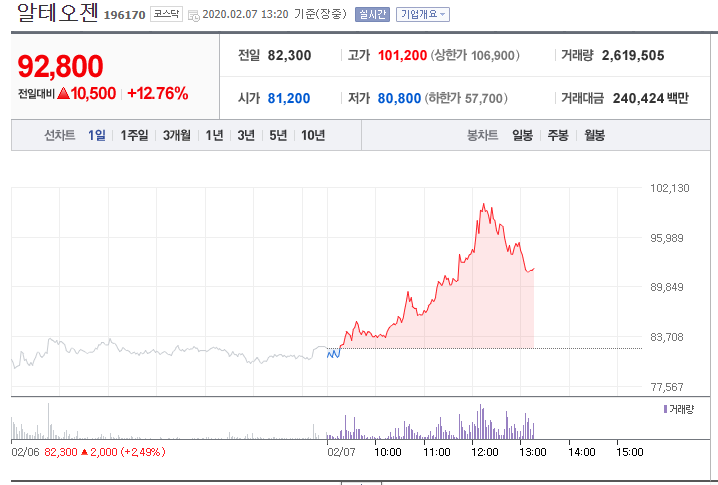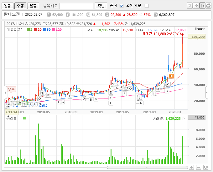 금융 | 2020년 02월 07일 14시 07분알테오젠은 2008년 설립되어 2014년 기술특례로 코스닥 시장에 상장한 바이오기업이다. 항체약물 융합(ADC) 기술등을 활용한 기존 바이오의약품을 개선하는 바이오베터 사업과, 이머징 마켓을 타겟으로 아일리아, 허셉틴 등 바이오시밀러 개발 사업을 진행하고 있으며, 최근 갑자기 주가가 급상승한 상태다.