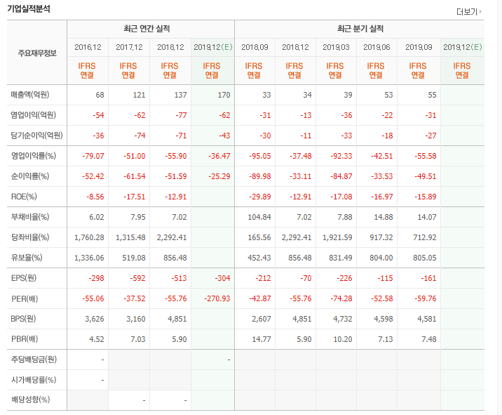 알테오젠의 매출액은 2015년 47억원에서 2018년 137억원으로 3년연속 증가중이지만 당기순이익은 -71억원을 기록하면서 3년 째 적자를 이어가고 있는 모습이다.