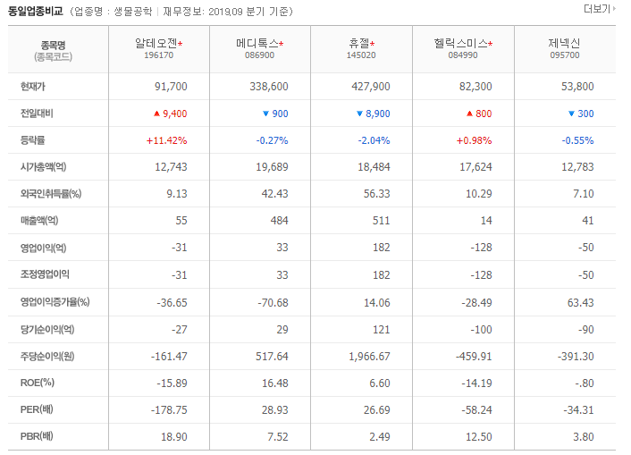 동일업종별 비교 분석을 해보면 메디톡스, 휴젤, 헬릭스미스, 제넥신 등의 경우 대부분 하락세를 보이고 있다. 헬릭스미스만 약간 전일대비 상승한 상태를 확인할 수 있다.