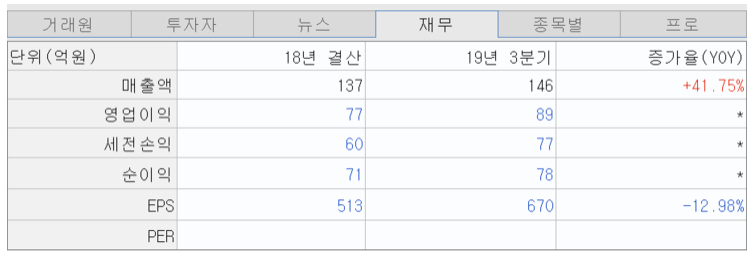자산총액은 2018년 714억원으로 2017년 대비 280억원 가량 증가하였고, 총 부채액은 47억원으로 7%의 낮은 부채비율을 보이고 있다.