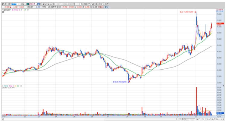 하지만 그 이후 정사 상승추세로 전환하며 주가가 다시 회복하는 모습을 보였었고, 2019년 12월 초에는 77,200원으로 고가 갱신 후 조정을 받았으나, 지속적으로 상승추세를 이어와서 현재까지 이르게 된 것이다.