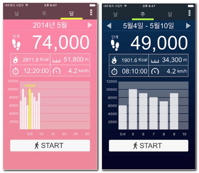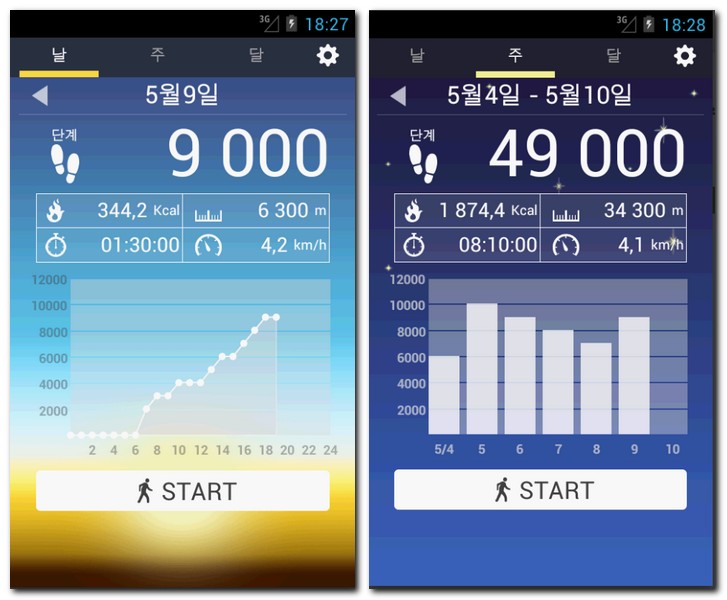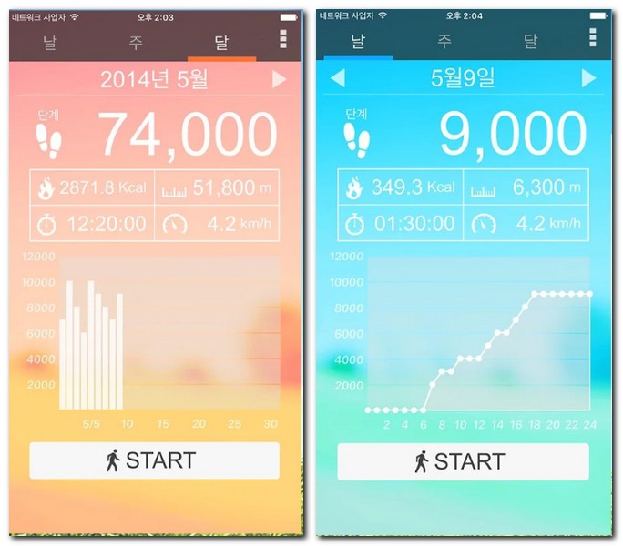 하루 만보걷기 효과를 누릴 수 있는 이유는 그만큼 강력한 기능을 가지고 있기 때문이다. 걸음수, 소비칼로리, 거리, 보행시간, 시속을 차례대로 터치하게 되면 그 항목의 정보가 그래프로 표시된다.