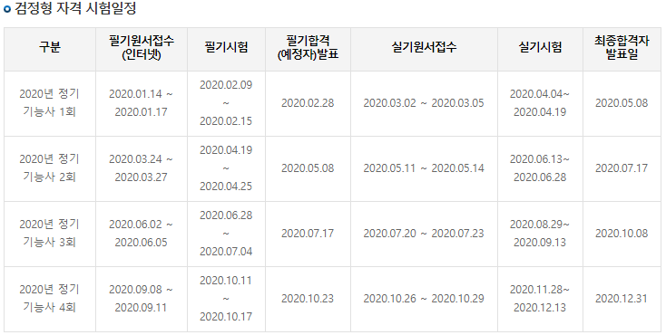 2020년 정기 기능사 1회는 2020.02.09 ~ 2020.02.15 필기시험을 치게 되며, 필기시험 합격자는 2020.02.28이다. 실기시험 원서접수는 2020.03.02 ~ 2020.03.05이며, 실기시험은 2020.04.04 ~ 2020.04.19 치뤄지게 된다. 최종합격자 발표일은 2020.05.08 이다.