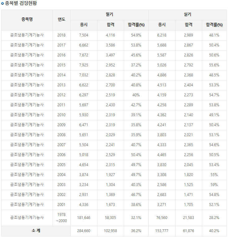 공조냉동기계기능사 자격증의 경우 경제성장과 더불어 산업체에서부터 가정에 이르기까지 냉동기 및 공기조화 설비 수요가 큰 폭으로 증가하였다.