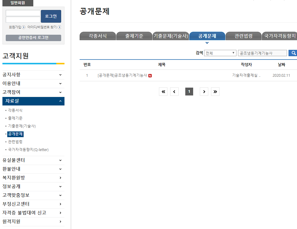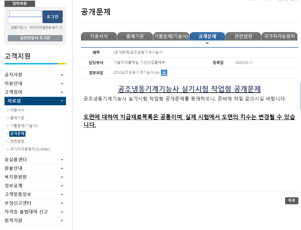 q-net(큐넷) 공식홈페이지에 방문하게 되면 실기시험 작업형 공개문제를 다운로드 받아 풀어볼 수 있다. q-net -> 고객지원 -> 자료실 -> 공개문제 -> 공조냉동기계기능사 검색 완료.