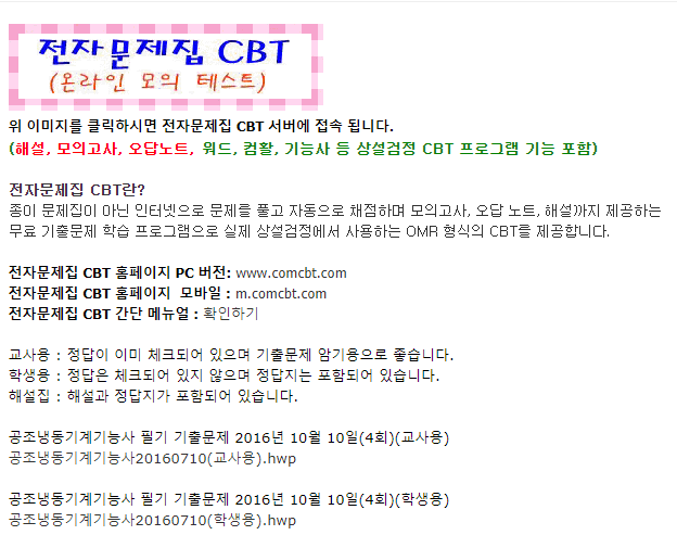 또한, CBT 전자문제집 사이트에서 과년도 출제문제 해설 및 기출문제를 풀어볼 수 있다. 공조냉동기계기능사 실기 필답형은 없지만 필기 기출문제 해설과 함께 요약 요점정리된 부분이 있기 때문에 자격증 시험 준비에 큰 도움을 받을 수 있다.