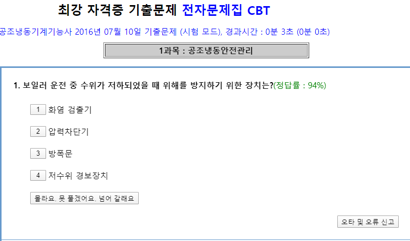 그럼 이처럼 기출문제를 풀어볼 수 있다. 공조냉동기계기능사 2016년 7월10일 기출문제를 시험모드로 진행된다. 시험을 보는중 실제로 시간도 표시된다.