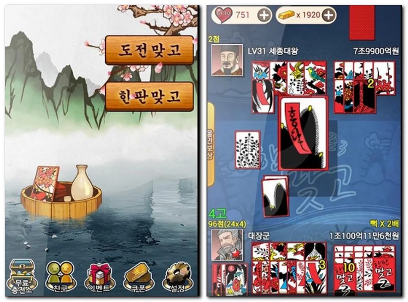 - 도전 맞고, 한판 맞고, 전국 맞고, 화투점을 한 게임에 플레이 가능